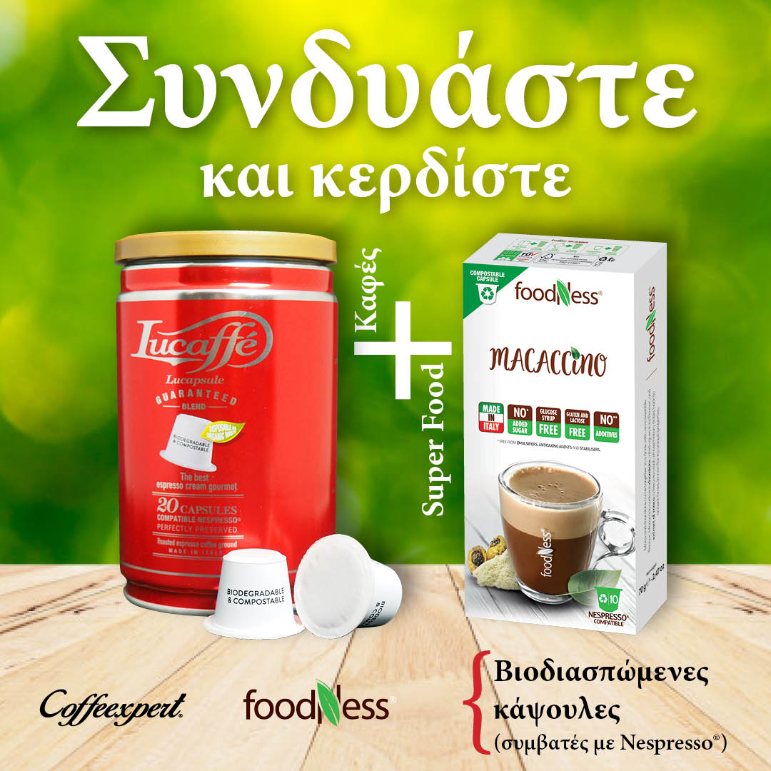 Εσείς παραγγέλνετε τις απολύτως ανακυκλώσιμες Lucaffe κάψουλες και εμείς σας προσφέρουμε ΔΩΡΟ μια συσκευασία Macaccino, ένα ρόφημα νέας γενιάς με διαλυτό καφέ, κακάο και εκχύλισμα Μάκα, γνωστό για τις έντονες αντί-στρες ιδιότητές του, πλούσιο σε αμινοξέα και μεταλλικά στοιχεία!